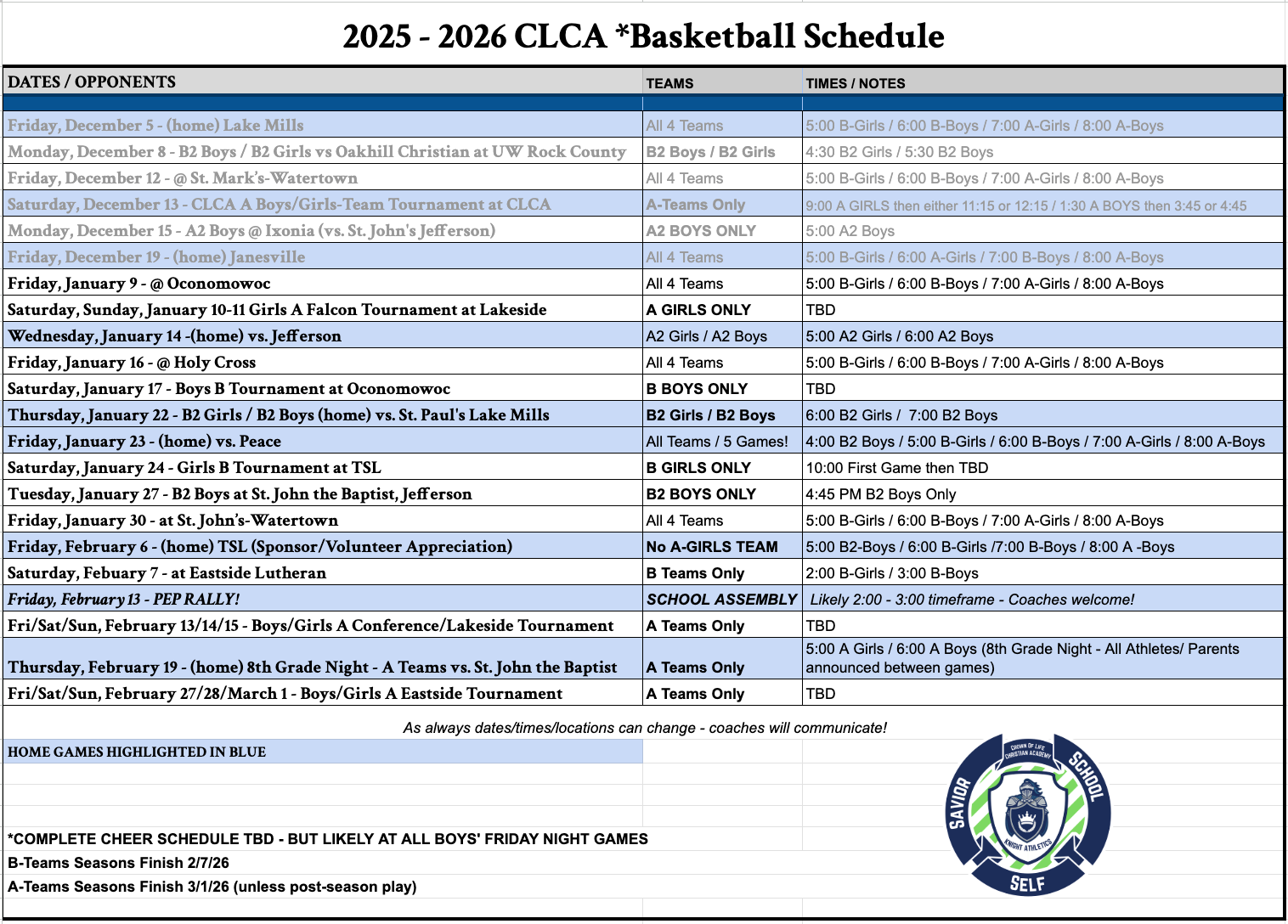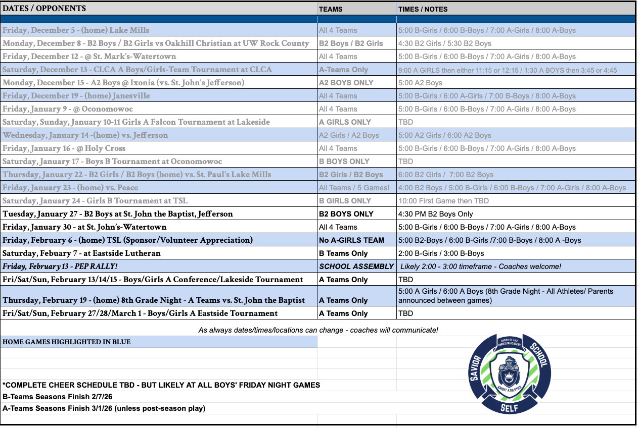 - Basketball (A-Team: 7th-8th boys/girls)/(B-Team: 5th-6th boys/girls)